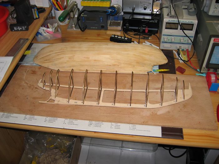 Die Spanten der 2. Hälfte wurden aufgeklebt.