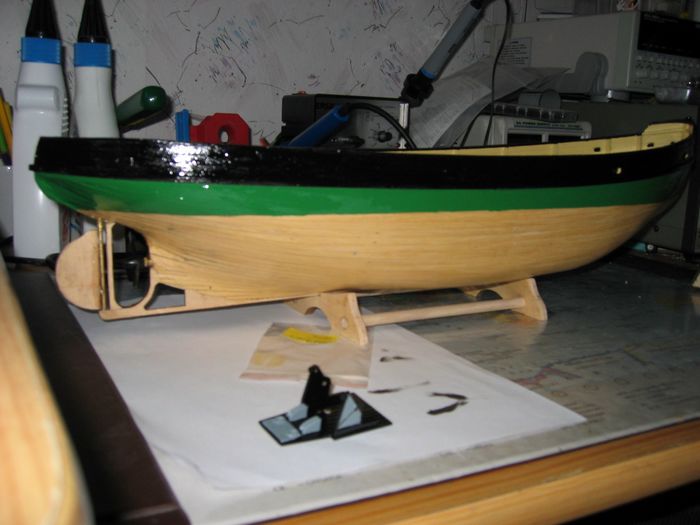 Der Bereich oberhalb der Wasserlinie wurde grün Lackiert. Im Vordergrund einige Teile der Ankerwinde.