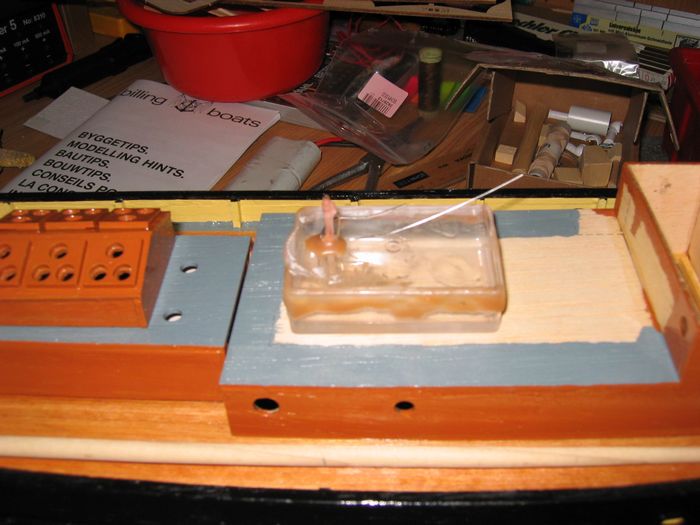 Als Dampferzeuger kommt ein Modell von Seuthe zum Einsatz welches direkt in einen Tank eingebaut werden kann. Als passender Tag wurde eine Kunststoff-Schraubenschachtel verwendet welche perfekt unter den Aufbau passt. So ist eine ordentliche Menge Dampföl an Bord. Unter dem hinteren Aufbauteil wurde ein Lautsprecher eingebaut der später den Sound des Dampfnebelhorns wiedergeben kann.