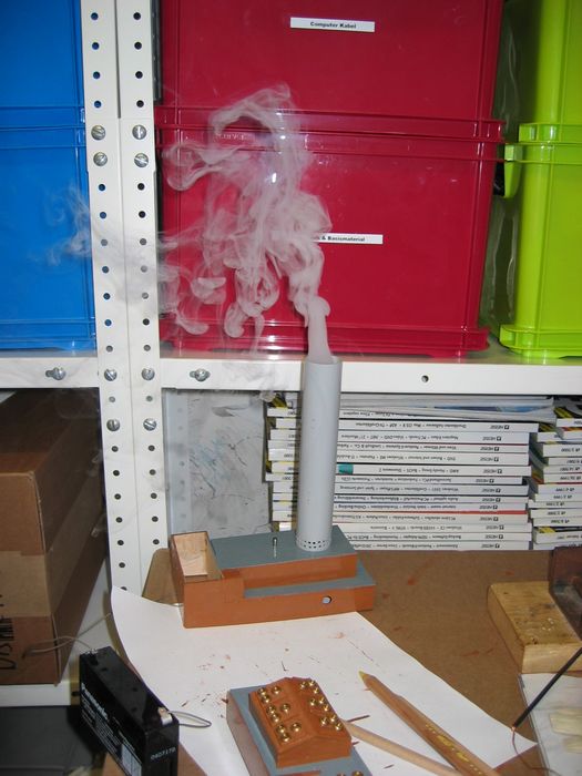 Test des Dampferzeugers. Damit eine Kaminwirkung im Schornstein entsteht und der Dampf oben heraus kommt musste eine Belüftung am Fuß des Schonsteins in Form von Lochreihen erstellt werden.