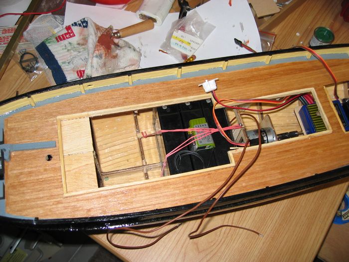 Damit das ganze Schiff später fahren kann werden nun die RC Komponenten eingebaut. Als Akku kommen drei 6V 1,5Ah Bleiakkus zum Einsatz. Damit kann das Schiff über eine Stunde gemütlich über den See dampfen.