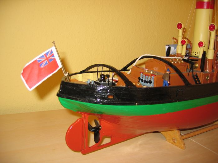 Weiterer Blick auf das Heck, beim Schleppen wird die Fahne samt Fahnenmast von Matrosen abgenommen um die Schleppleine nicht zu behindern. Fahne und Fahnenmast sind auch im Modell abnehmbar.